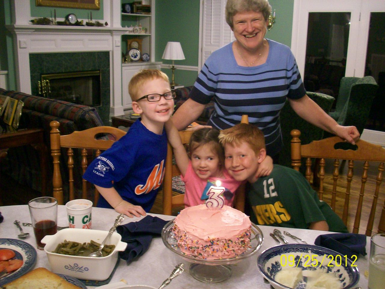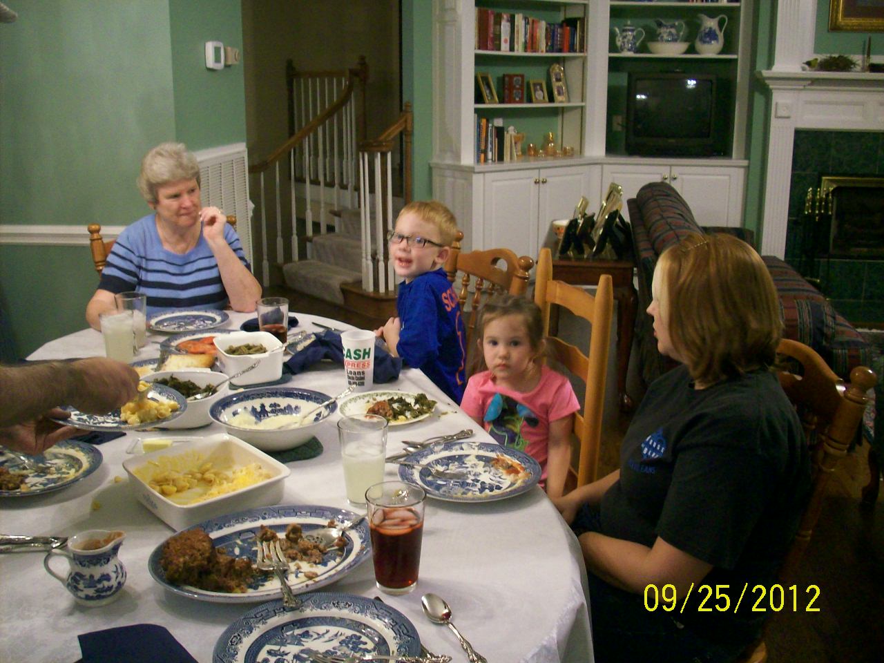 So we gathered around a meal of meatloaf, mashed potatoes, green beans, mac & cheese, mixed greens, sliced tomatoes, cornbread, Crystal Light, and lemonade. That's really good Southern eating.