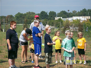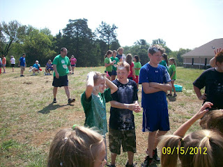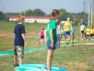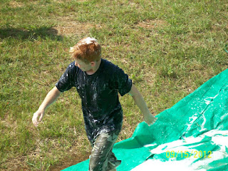 The first activity was dodge ball with wading pools being the three bases. First base was ramen noodles, second base was cotton balls in water and third base was mashed potatoes. Are you getting the picture yet? Home base was perched over an earth bank on a slip-and-slide. A water slide no less! Although the grandchildren tried to be careful to not get wet, soon getting wet and messy became their primary goal. All the others were doing the same. Here are some pictures of the group.