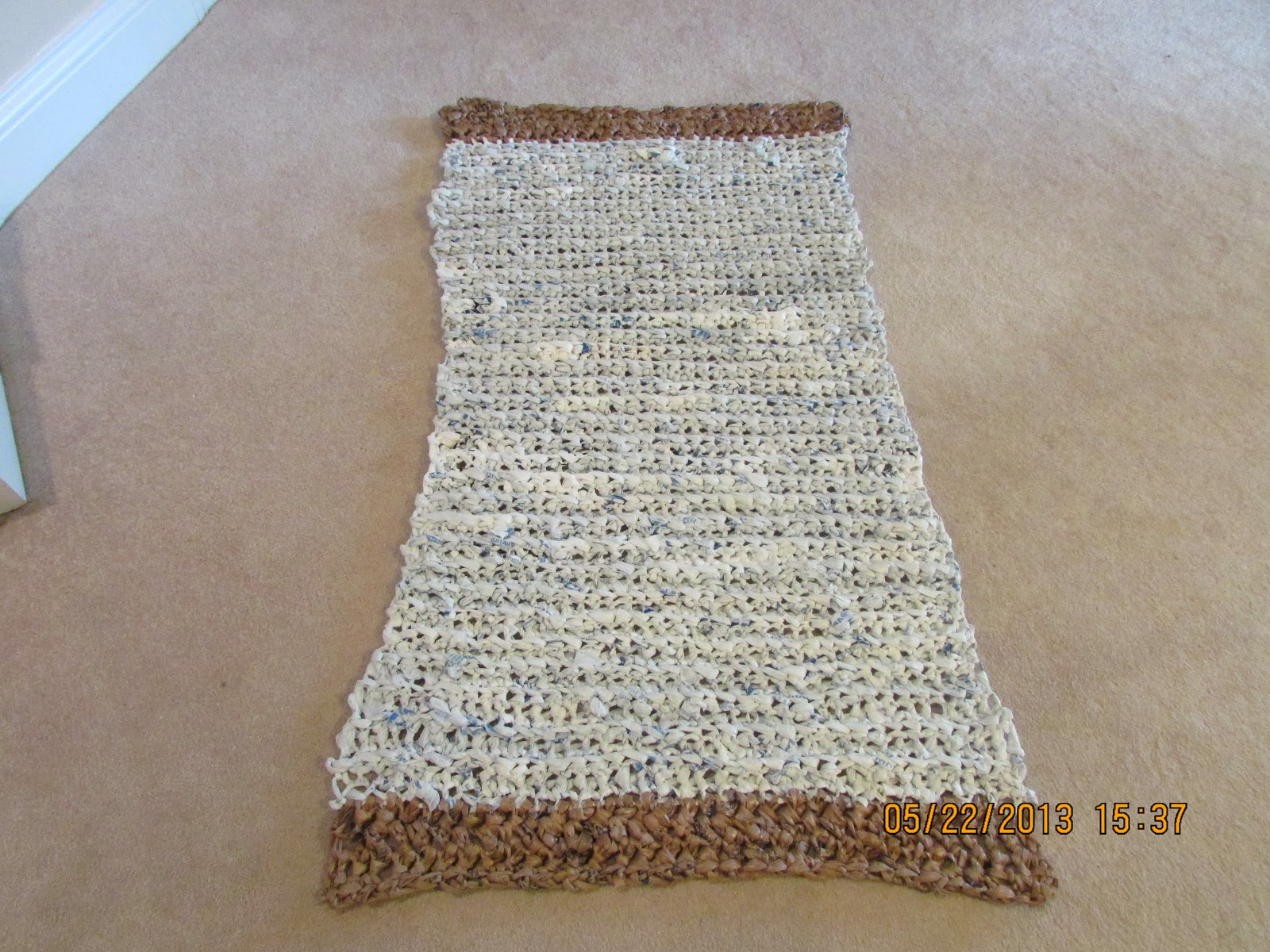 All the mats were different. Due to the colors of the grocery bags, we could make patterns, use different types of stitches or make different sizes of mats. I used WalMart bags for the blue and white pattern in the main part of the rug. I trimmed the edges with brown Kroger bags.