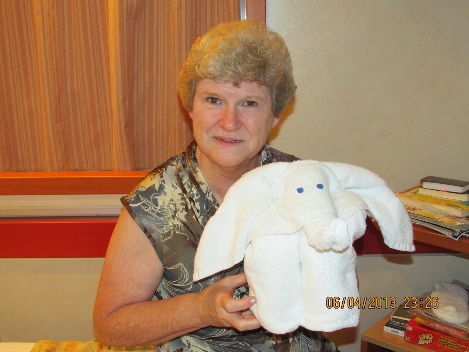 The towel animals were fun to receive. The rooms were always cleaned when we returned each day and the animals gave us something to look forward to. The others stayed in rooms across the hall, so they usually had a different towel animal than we had.